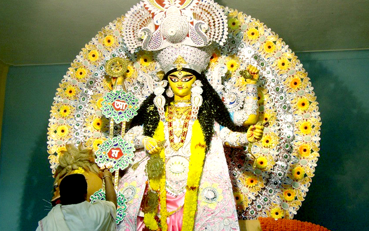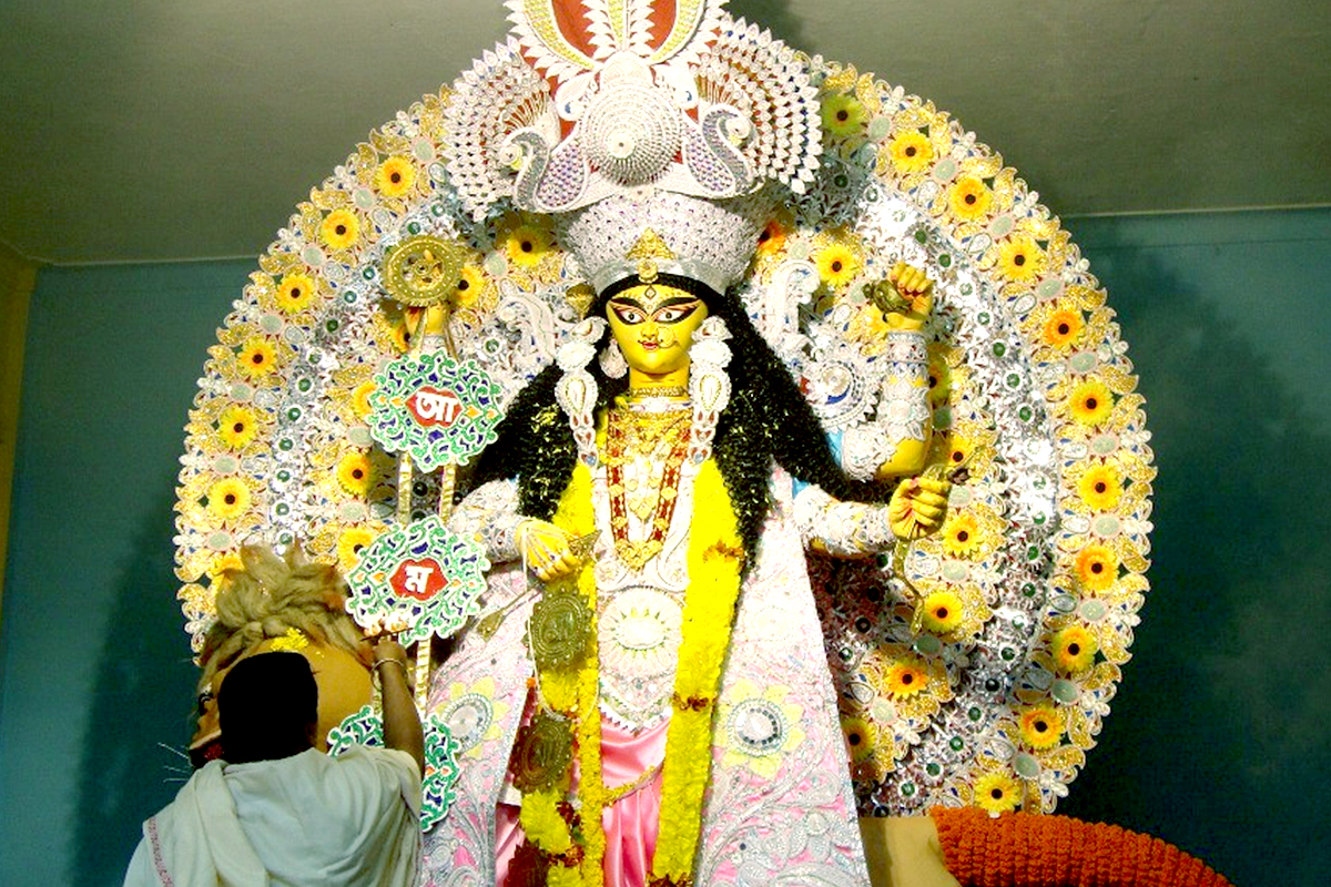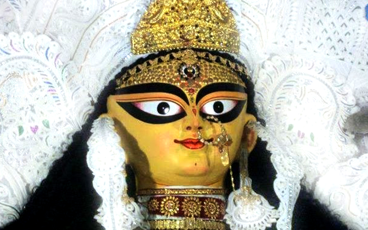 The Jagadharti Puja was first started by Maharaja Krishnachandra of Krishnanagar, Nadia in Bengal. Jagadhatri Puja is very popular in Krishnanagar, Rishra, Chandannagar, Bhadreswar, Hooghly, Boinchi. The Jagadhatri puja of Bose family, Palpara, deserves a special mention in this regard. The puja of this family initially used to be held in their ancestral home in Murshidabad. Folklore has it that this puja was started in 1788. The exact history of the deity is unknown, but family records date it back to 1640. Jagaddhatri figures in the semi-historical fictional work 'Anandamath' written by Bankim Chandra Chatterjee, from which book the national song of India "Vande Mataram" is taken. In the novel, Kali, Durga and Jagaddhatri are depicted as three aspects of 'Bharat Mata' (Mother India) - Jagaddhatri as the mother used to be, Durga as the mother will be in future.
